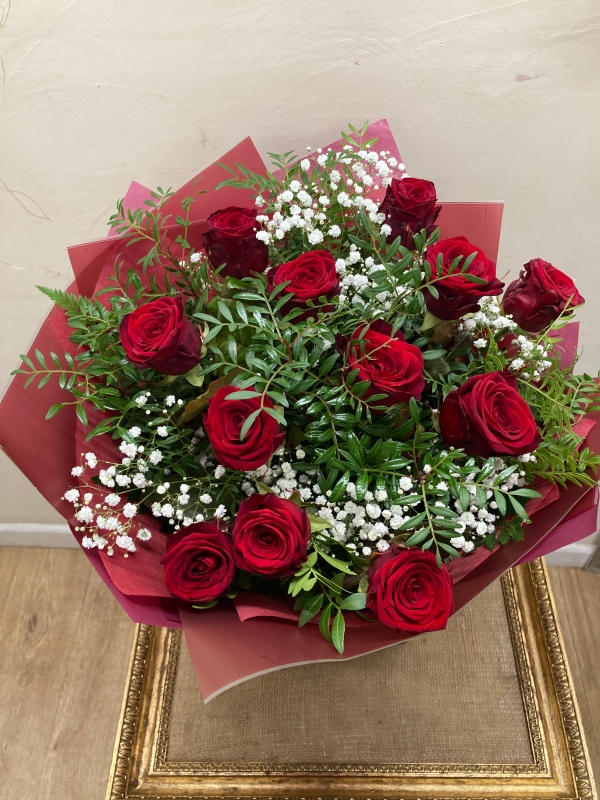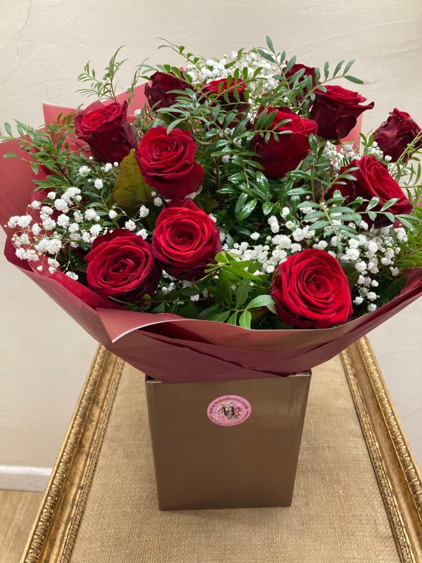 A gorgeous bouquet of 12 red roses and choice foliages, aqua packed in a presentation box