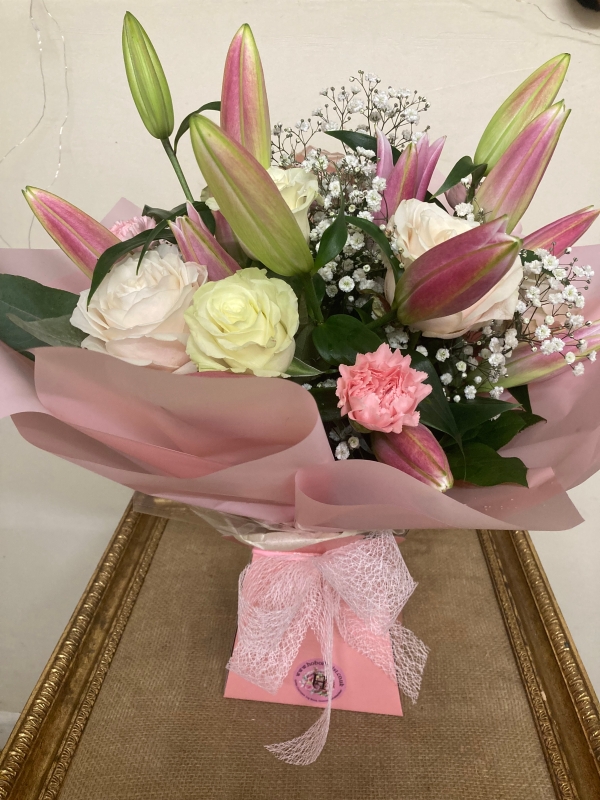 A beautiful, aqua packed hand tied bouquet, of scented lilies, roses, carnations and choice foliages.