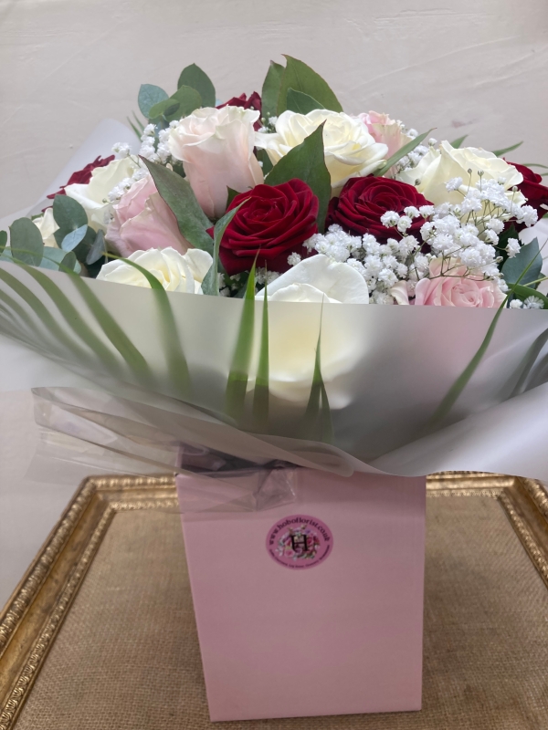 A gorgeous hand tied, aqua packed bouquet of 20 mixed red, pale pink and ivory roses, with gypsophlia and choice foliages, in a presentation box.