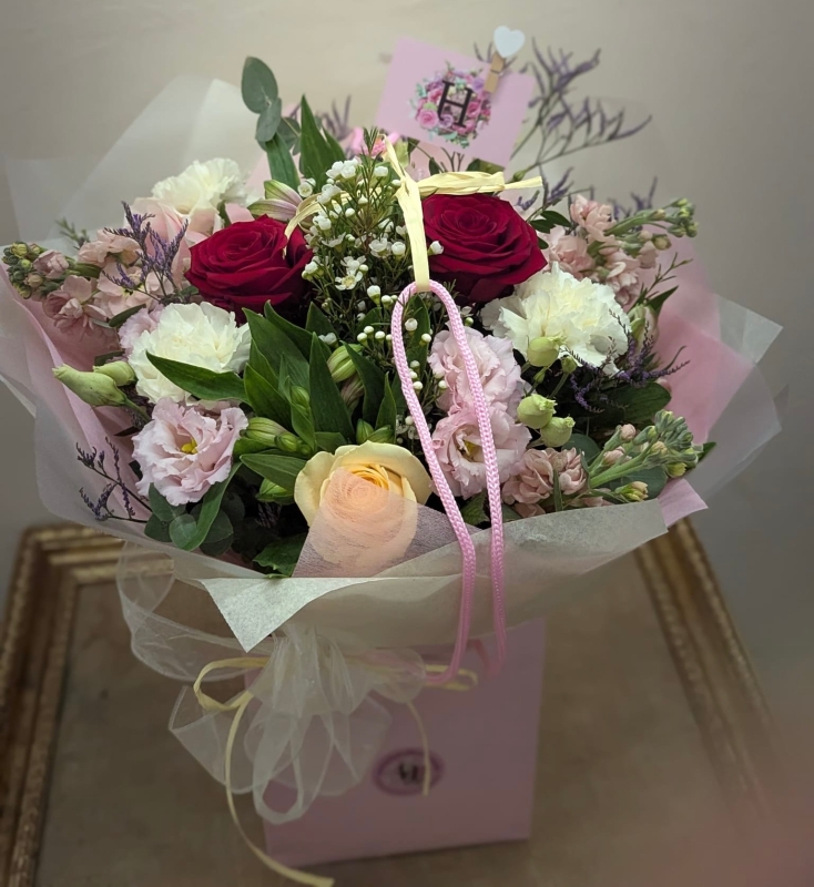 A gorgeous, aqua packed hand tied bouquet, including ivory and red roses.